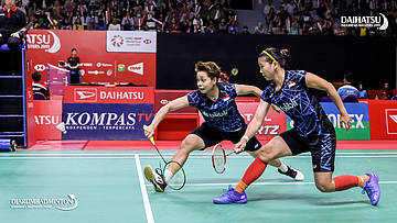 Greysia POLII/Apriyani RAHAYU ((Indonesia) berusaha menyambut serangan