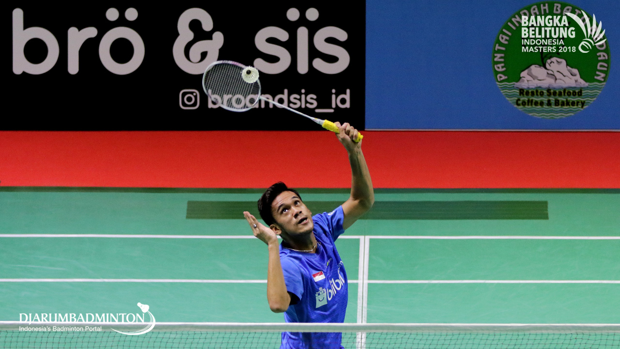 Ruselli Hartawan (INA) berusaha menggapai shuttlecock