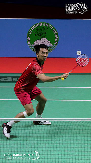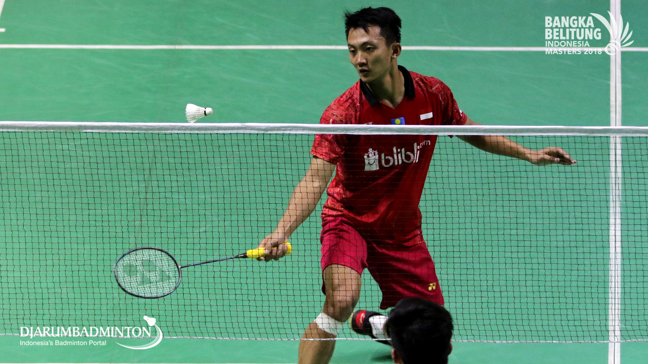 Ihsan Maulana Mustofa (INA) mengembalikan shuttlecock