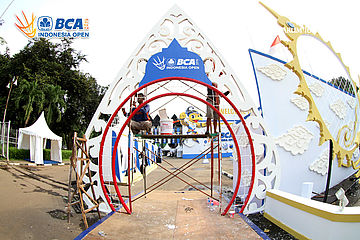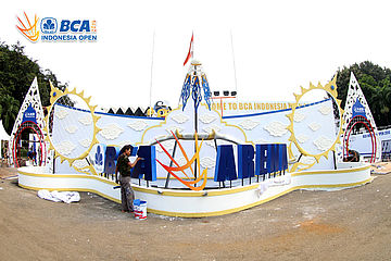 Salah satu pekerja saat mendekor pintu masuk pengunjung BCA Indonesia Open Super Series Premiere 2014