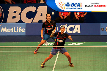 Deariska Putri/Nurbeta Kwanrico (Indonesia) bersiap menghadang pengembalian dari Maretha Dea/Melati Daeva (Indonesia)