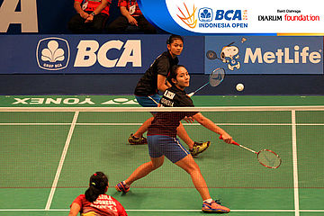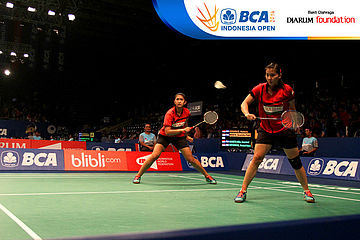 Marsheilla Gischa/Ramadhani Hasiyanti (Indonesia) bersiap menyambar pengembalian tanggung dari Clara Titi/Desaula Gendy (Indonesia)
