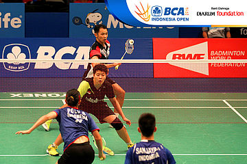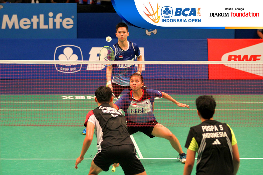 Fran Kurniawan/Shendy Puspa (Indonesia) mengembalikan shuttlecock ke arah Kevin Sanjaya/Gresya Polii (Indonesia)