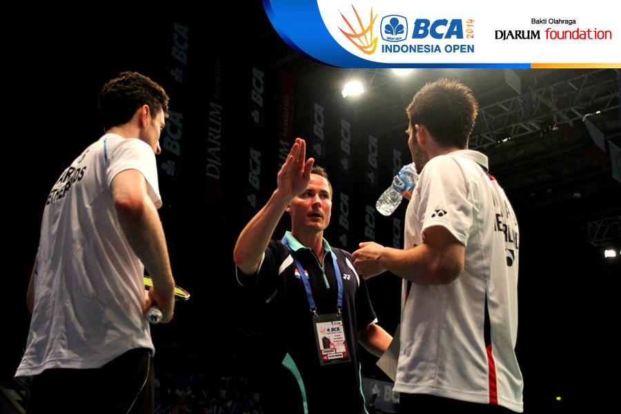 Rendra Wijaya/Rian Sukmawan (Indonesia) berhasil menghadang pengembalian dari Jacco Arends/Jelle Maas (Belanda)