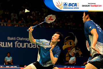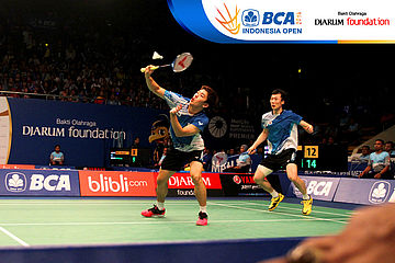 Lee Yong Dae/Yoo Yeon Seong (Korea Selatan) menghadang serangan yang dilepaskan Takeshi Kamura/Keigo Sonoda (Jepang)