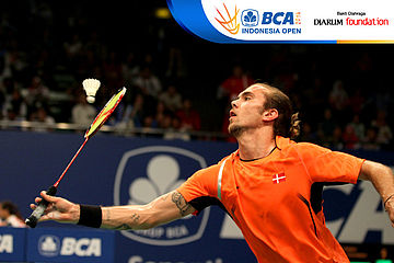 Jan O Jorgensen (Denmark) mengembalikan shuttlecock ke arah Takuma Ueda (Jepang)