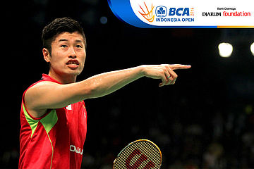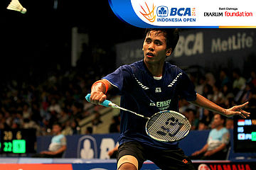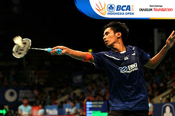 Alamsyah Yunus (Indonesia) mengembalikan shuttlecock ke arah Sho Sasaki (Jepang)