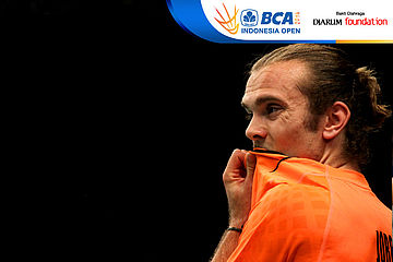 Ekspresi Jan O Jorgensen (Denmark) saat kehilangan poin