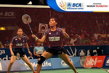 Greysia Polii/Nitya Krishinda (Indonesia) bersiap menyambut pengembalian dari Mingtian Fu/Yu Yan Vanessa (Singapura)