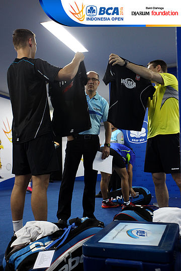 Adam Cwalina dan Przemyslaw Wacha (Polandia) saat pemeriksaan kelengkapan jersey
