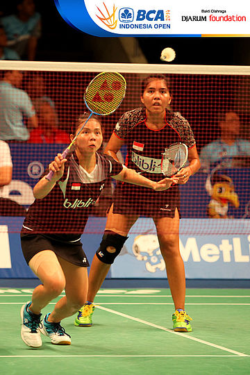 Nitya Krishinda M/Greysia Polii (Indonesia) mengembalikan smash dari pasangan Ma Jin/Tang Yuanting (China)