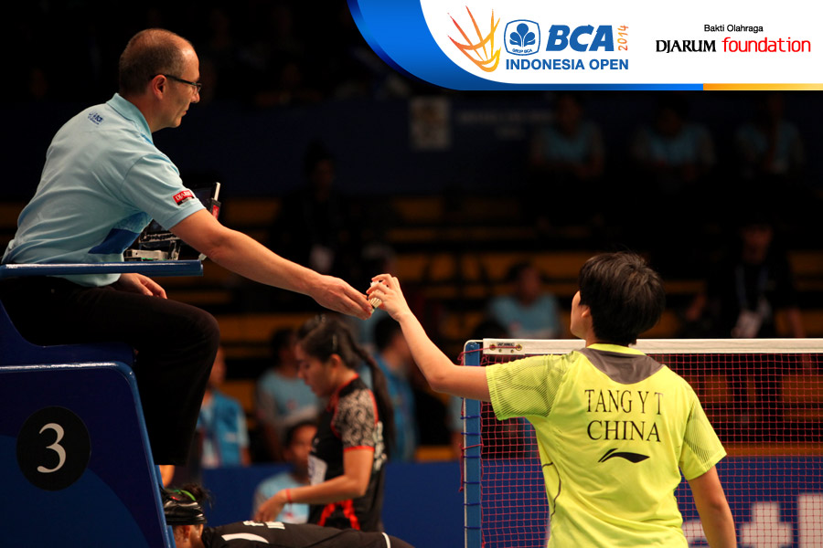 Tang Yuanting (China) meminta pergantian shuttlecock