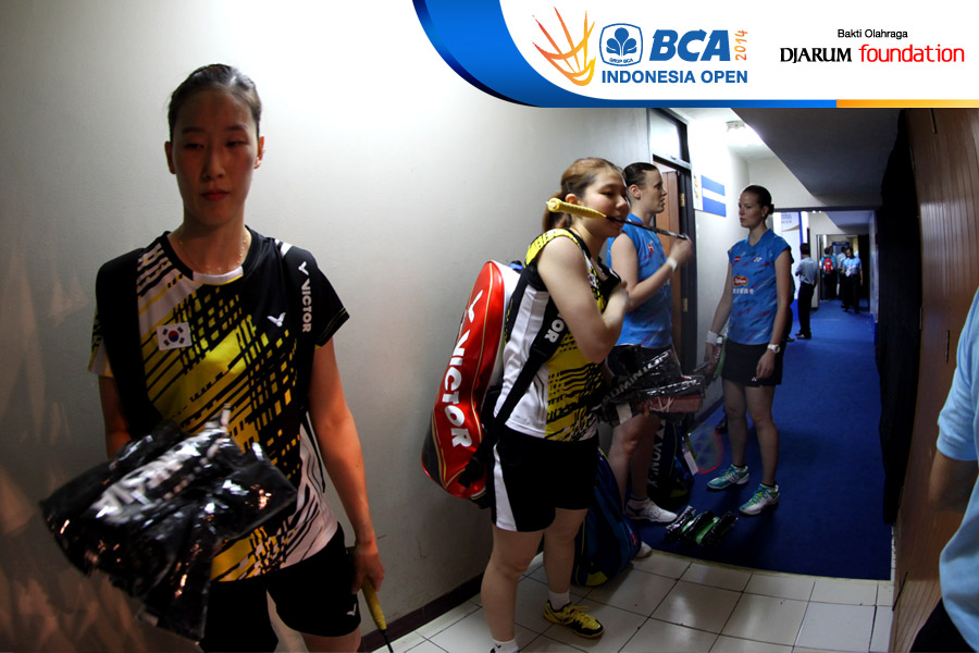 Jang Ye Na/So Young Kim (Korea) dan Christinna Pedersen/Kamila Rytter Juhl (Denmark) bersiap memasuki lapangan pertandingan