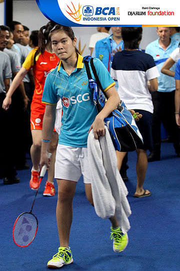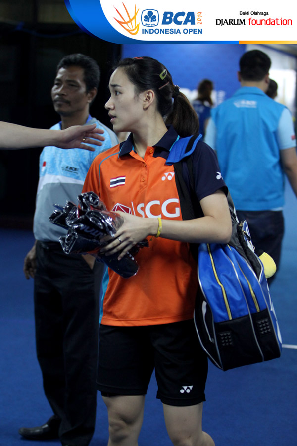 Busanan Ongbumrungpan (Thailand) berjalan ke arah player lounge seusai bertanding