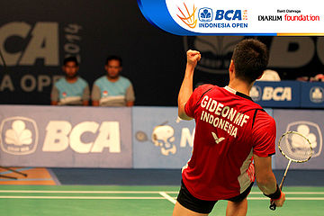 Selebrasi Markus Fernaldi Gideon (Indonesia) setelah berhasil mencuri poin dari pasangan Hendra Setiawan/Mohammad Ahsan (Indonesia)