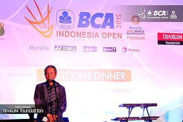 Ketua PP PBSI, Gita Wirjawan saat memberikan sambutan pada acara Welcome Dinner BCA Indonesia Open Super Series Premier 2015.