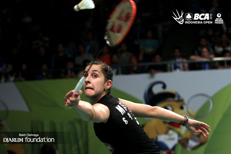 Ekspresi Carolina Marin (Spanyol) saat mencetak poin.
