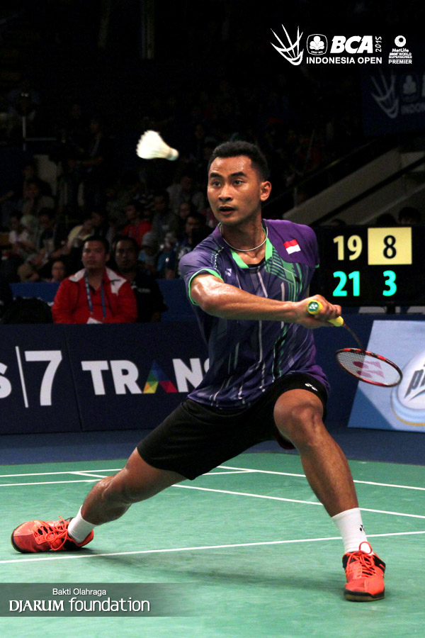 Tommy Sugiarto (Indonesia) mengembalikan shuttlecock ke arah Lin Dan (China).