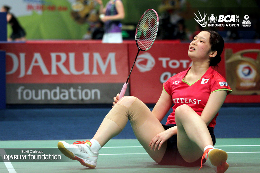 Minatsu Mitani (Jepang) harus terjatuh saat meladeni perlwanan dari Adrianti Firdasari (Indonesia).