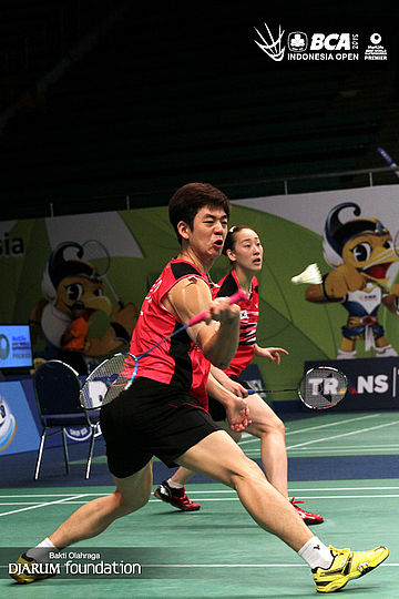 Lee Yong Dae/Lee So Hee (Korea) bersiap menghadang serangan dari Mads Pieler/Kamilla Rytter Juhl (Denmark).