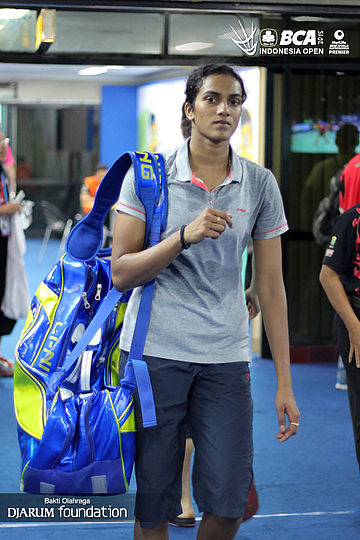 P.V Sindhu (India) berjalan di player lounge.