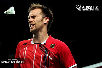 Marc Zwiebler (Jerman) menyambut pengembalian dari Tommy Sugiarto (Indonesia).