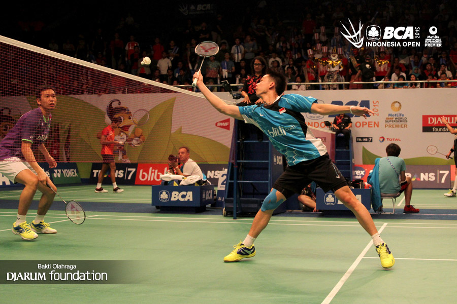 Kevin Sanjaya (Indonesia) mengembalikan shuttlecock ke arah Hendra Setiawan (Indonesia).
