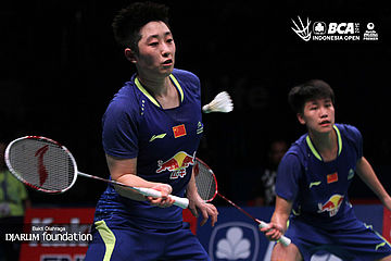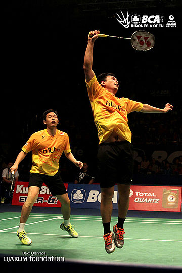 Hendra Setiawan/Mohamad Ahsan (Indonesia) melepaskan serangan ke arah Fu Haifeng/Zhang Nan (China).