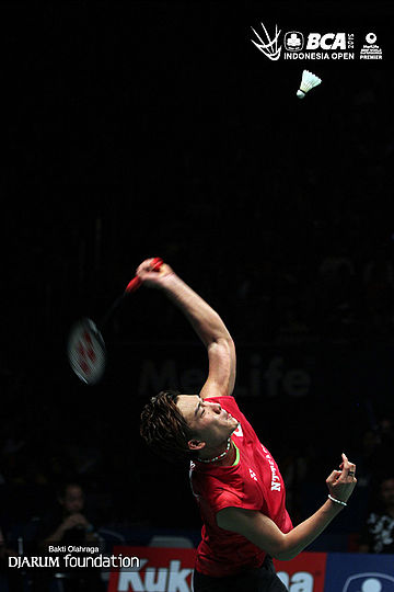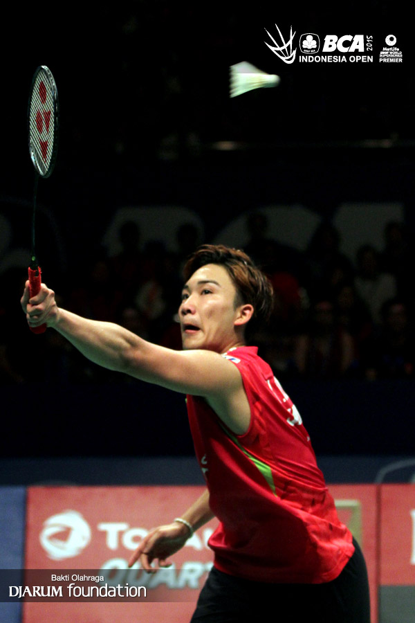 Kento Momota (Jepang) bersiap melepaskan serangan