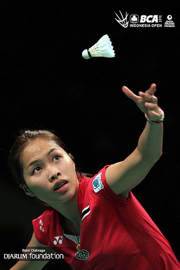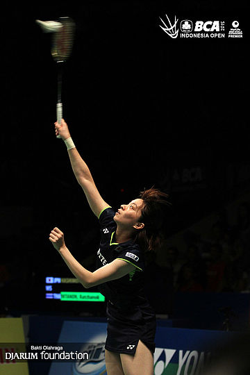 Ratchanok Intanon (Thailand) melepaskan serve