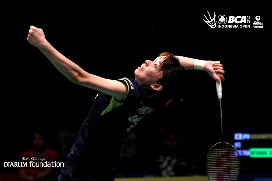 Yui Hashimoto (Jepang) melepaskan serangan ke arah Ratchanok Intanon (Thailand)