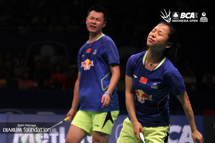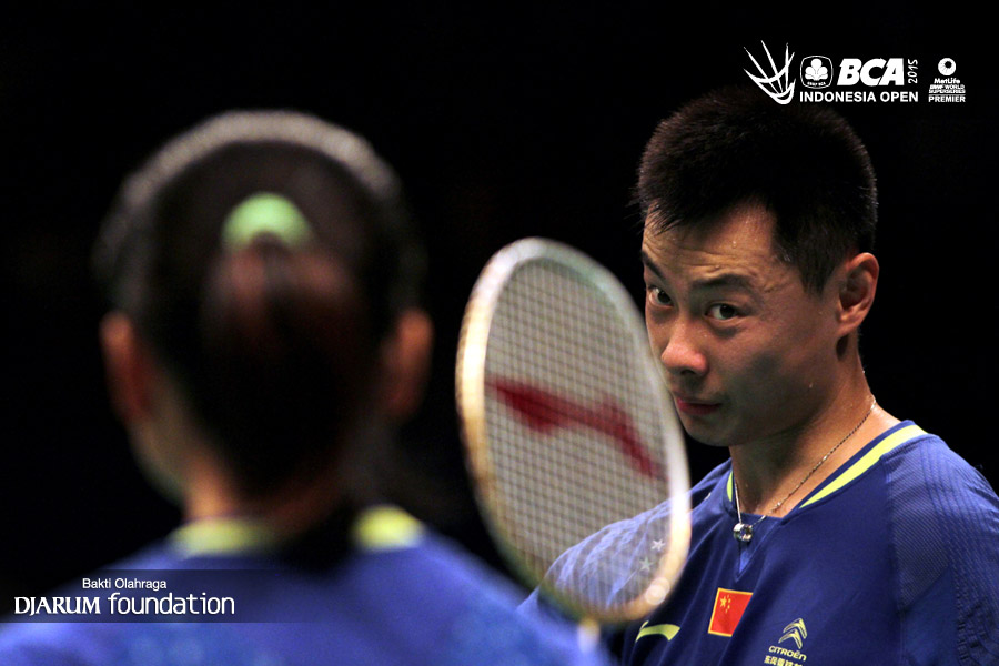 Xu Chen/Ma Jin (China) saling berkoordinasi dilapangan