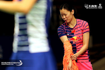 Wang Yihan (Tiongkok) saat melakukan peregangan sebelum berlatih