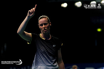 Ekspresi Kamilla Rytter Juhl (Denmark) saat berlatih