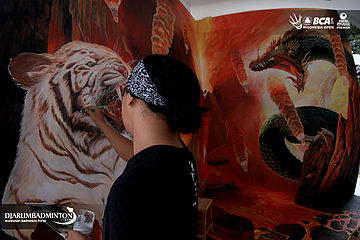 Seorang pekerja sedang melukis di booth Djarum Foundation