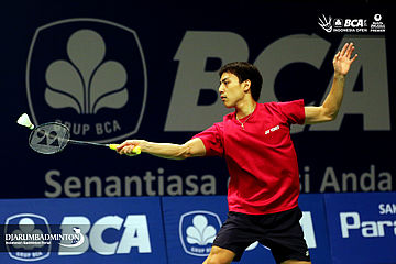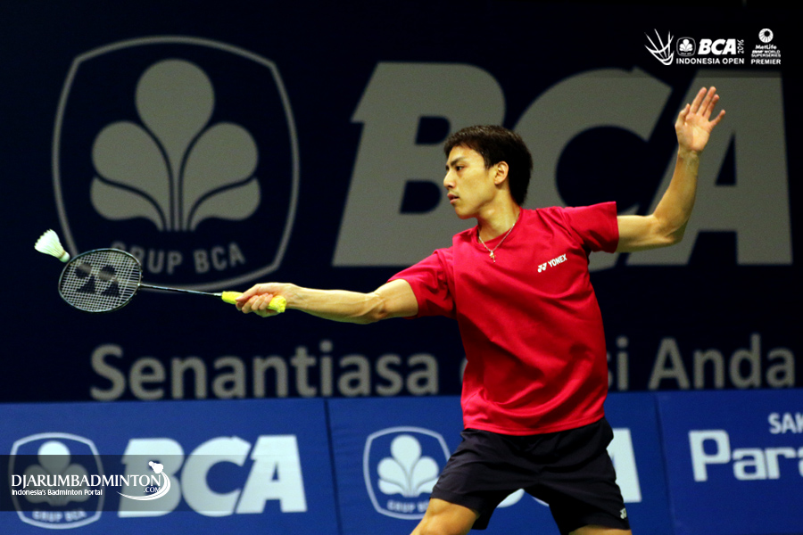 Takuma Ueda (Jepang) mengembalikan shuttlecock saat berlatih