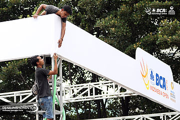 Dua pekerja saat menyelesaikan dekorasi BCA Indonesia Open Super Series Premiere 2016