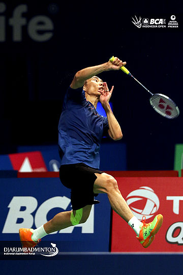 Ihsan Maulana Mustofa (Indonesia) menggigit raketnya