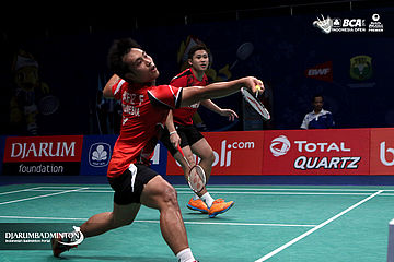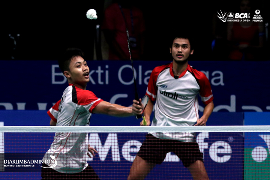 Akbar Bintang/Angger Sudrajat (Indonesia) mengembalikan shuttlecock