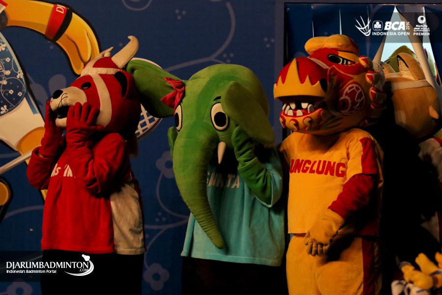 Para maskot sebelum tampil memeriahkan ajang BCA Indonesia Open Super Series Premier 2016