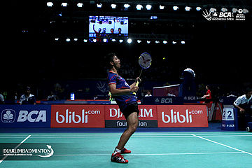 Wang Shixian (Tiongkok) mengembalikan shuttlecock