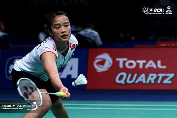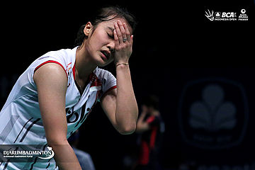 Sung Ji Hyun (Korea) mengembalikan shuttlecock