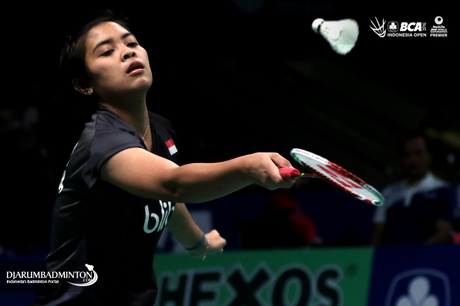 Gregoria Mariska (Indonesia) mengembalikan shuttlecock