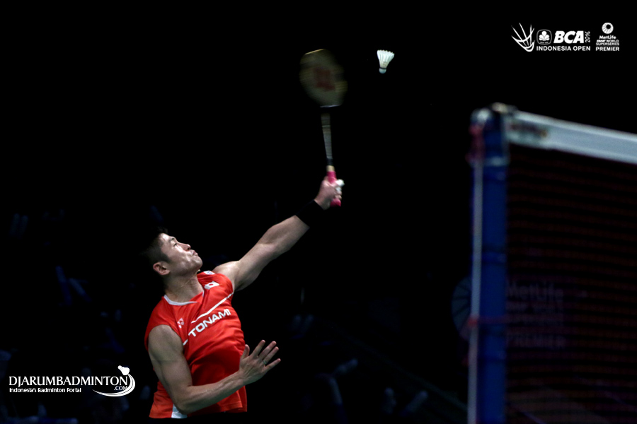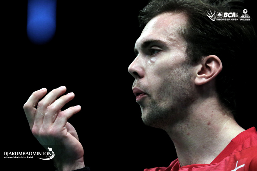 Jan O Jorgensen (Denmark) mengembalikan shuttlecock