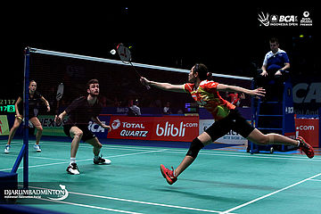 Alfian Eko Prasetya/Annisa Saufika (Indonesia) menyambar pengembalian tanggung