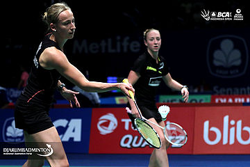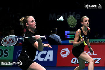 Eefje Muskens/Selena Piek (Belanda) mengembalikan shuttlecock