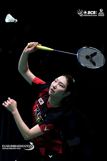 Sung Ji Hyun (Korea) mengembalikan shuttlecock