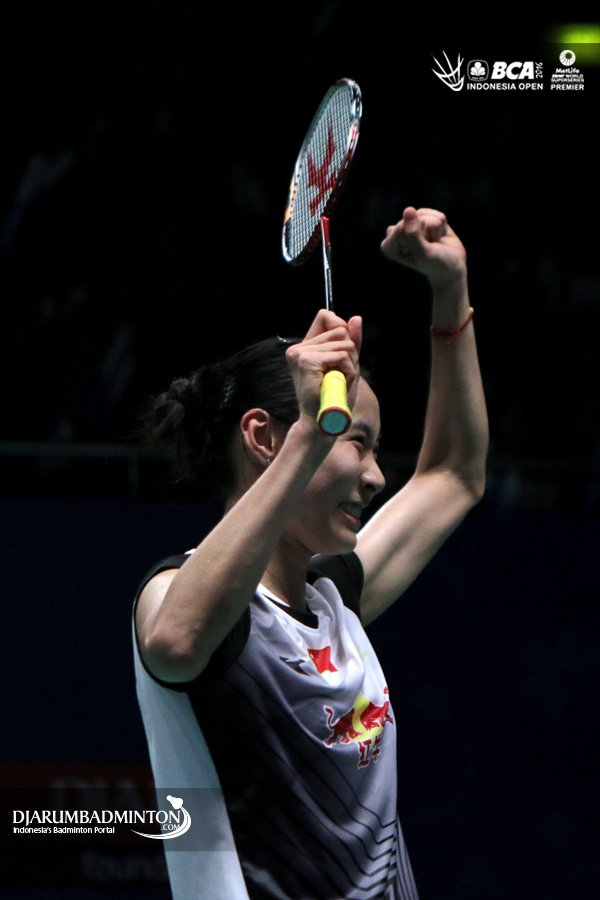 Selebrasi kemenangan Wang Yihan (Tiongkok)