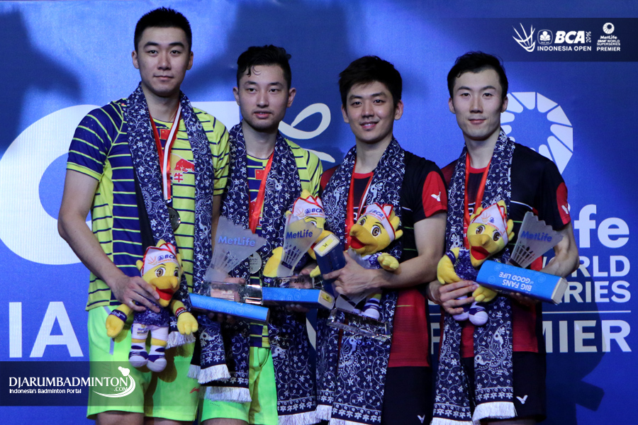 Chai Biao/Hong Wei (Tiongkok) dan Lee Yong Dae/Yoo Yeon Seong (Korea) di podium