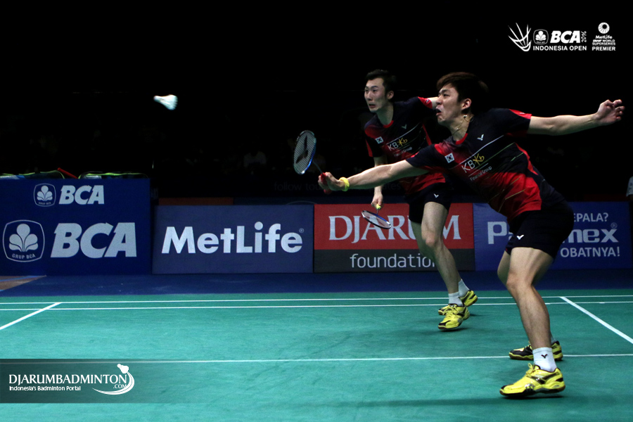 Lee Yong Dae/Yoo Yeon Seong (Korea) menghadang serangan